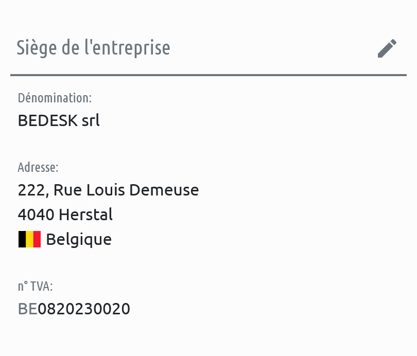 Les coordonnées du siège de votre entreprise sont enregistrées dans le widgetWidget Élément de l'interface qui regroupe un ensemble d'informations. Un widget se compose généralement d'un titre et d'un contenu qu'il est souvent possible d'éditer. « Siège de l’entreprise ». Il s’agit de l’adresse postale, de la dénomination ainsi que du numéro de TVA européen de votre entreprise.