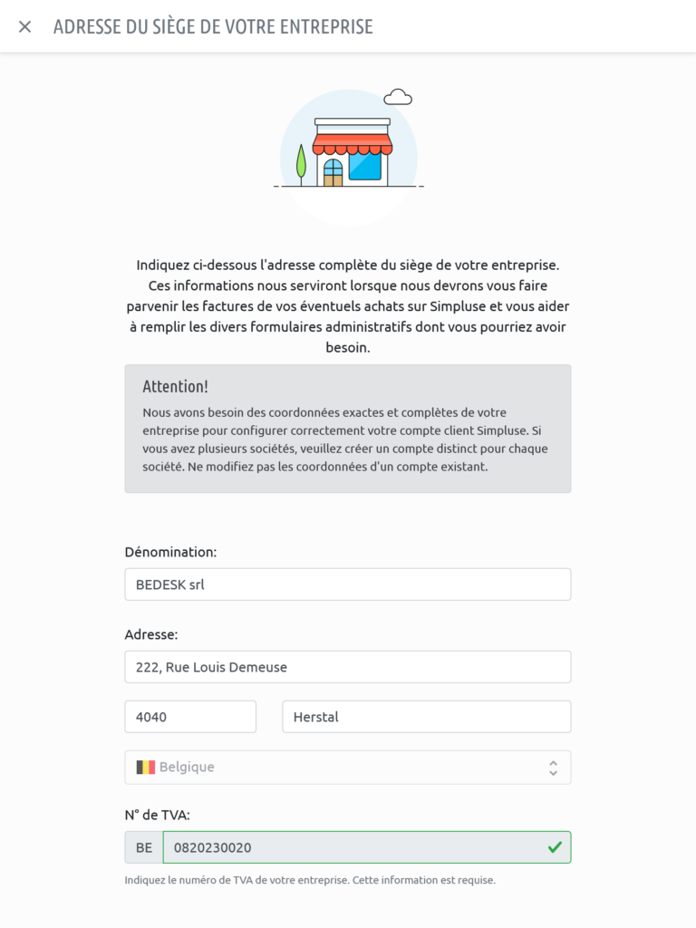 Une nouvelle page de dialogue s’ouvre. Vous pouvez désormais modifier la dénomination de l’entreprise et/ou l’adresse postale.