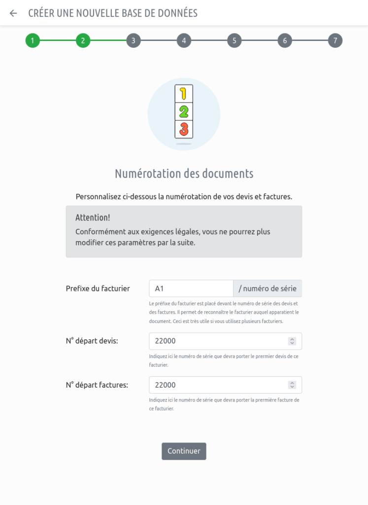 Indiquez à présent les paramètres de numérotation de vos documents. Il s’agit, plus précisément, des numéros de série de départ pour les devis et les factures.