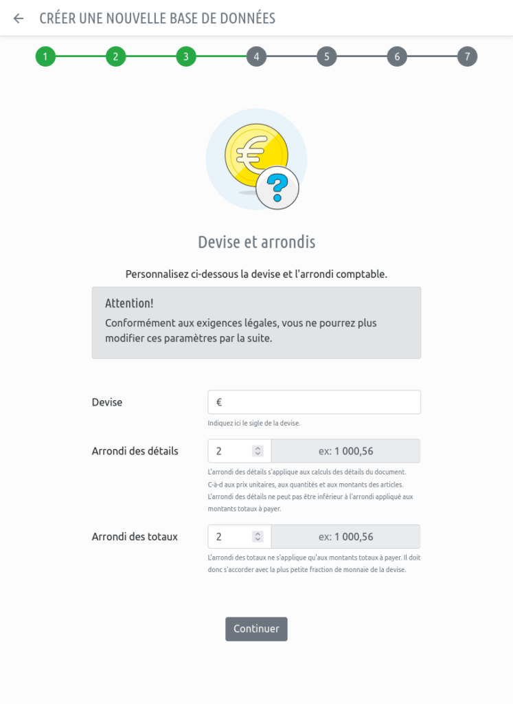 Vous devez aussi indiquer les paramètres d’arrondis des montants. Par défaut, l’arrondi proposé est celui qui s’applique à l’Euro, autrement-dit au centime d’Euro. Il faut donc, dans le cas de l’Euro, compter 2 chiffres après la virgule. Pour votre facilité, un exemple est affiché en regard du paramètre.