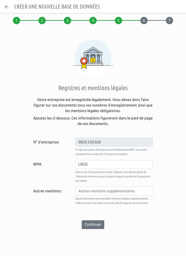 Vous pouvez à présent indiquer les mentions légales qui doivent apparaitre sur vos documents. Elles seront généralement placées dans le pied de page de vos devis et factures.
