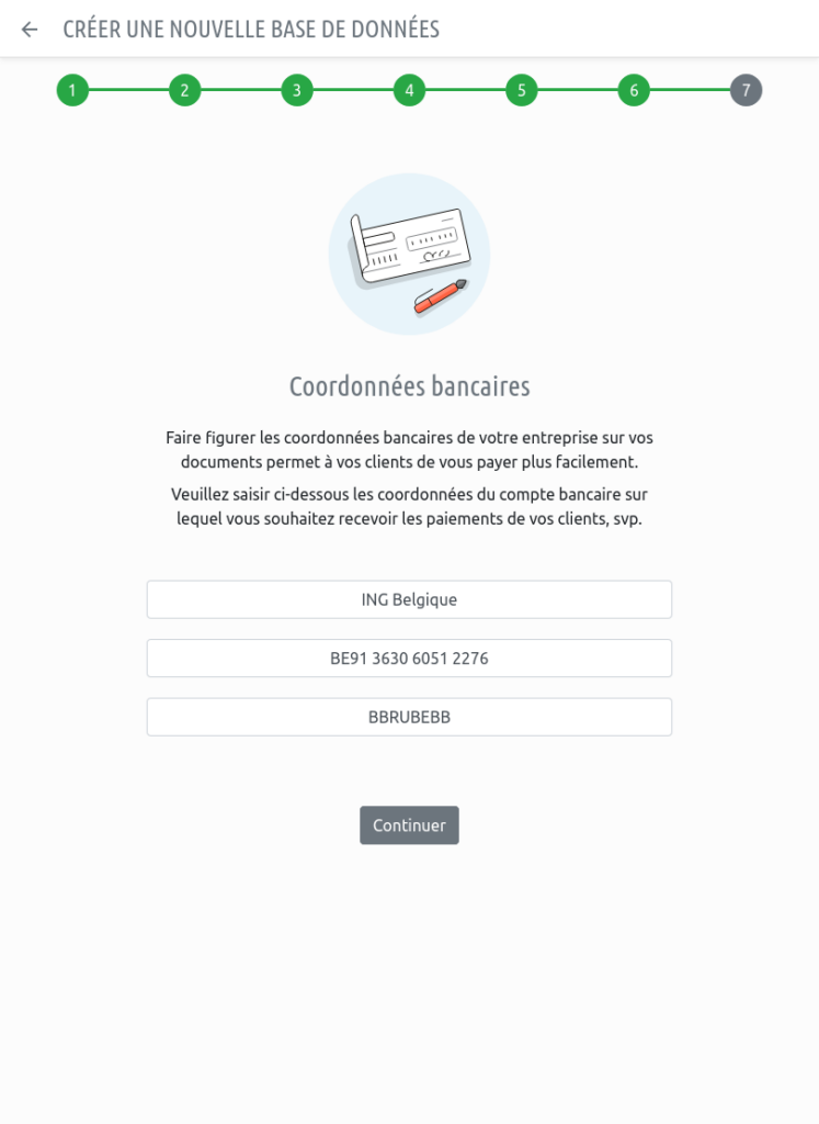 Introduisez le numéro IBAN de votre compte bancaire, ainsi que le code BIC de votre banque. Pour éviter toute erreur de saisie, l’application vérifie le format du numéro de compte IBAN que vous introduisez, ainsi que celui du code BIC de la banque. Vos clients pourront ainsi vous payer sans difficulté.