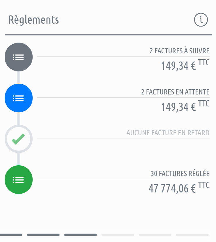 Par exemple, si dans le tableau « Règlements » de mes factures, une ligne indique 149,34 € en attente, un clic sur la bulle vous montrera les factures correspondantes.